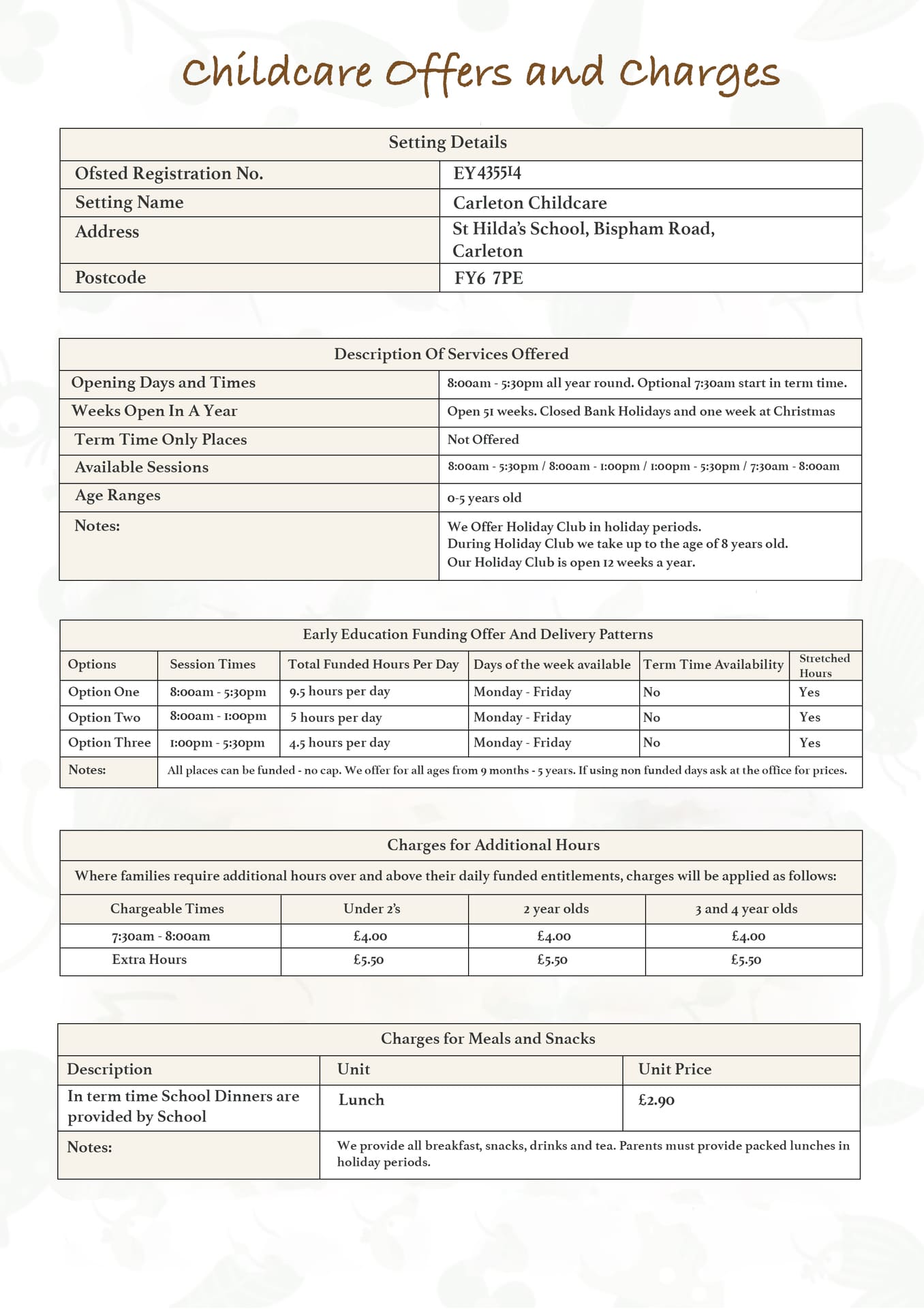 All three and four year olds are entitled to 15 hours of free nursery education for 38 weeks of the year. (the term after their 3rd birthday). This applies until they reach compulsory school age (the term following their fifth birthday) some parents may also be entitles to 30 hours grant. call in for details.